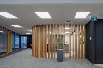 Pro PREMIER interiors s kterými dlouhodobě spolupracujeme, jsme realizovali vybavení kanceláří celkem pro 45 osob. U této zakázky bylo zajímavé, že jsme zajišťovali skoro více výroby kovových prvků než dřevěného nábytku. Největší výzvou byla kovová stěna s lakovanými posuvnými dveřmi a s různými typy výplní jako je tahokov, děrovaný plech. Atypická jsou také kovová dvířka u pojízdných skříněk s výplní z tahokovu, museli jsme totiž zajistit subtilnost všech kovových prvků. Co se týká nábytku, který vidíte na fotkách, použili jsme nový typ našich stolů s konstrukcí typu "O" a vyrobili jsme držáky na paravány.