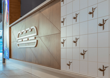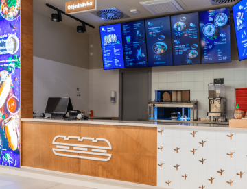 Tuto realizaci jsme zvládli za 2 noci, poradili jsme si s malým prostorem a vyrobili pracovní desku z umělého kamene na míru. Naší prací je i prvek bagety, který je opracovaný na CNC z vysokotlakého laminátu. Symbol volavky na pravé straně pultu je vytvořen pomocí vodního paprsku z vysokotlakého laminátu.
